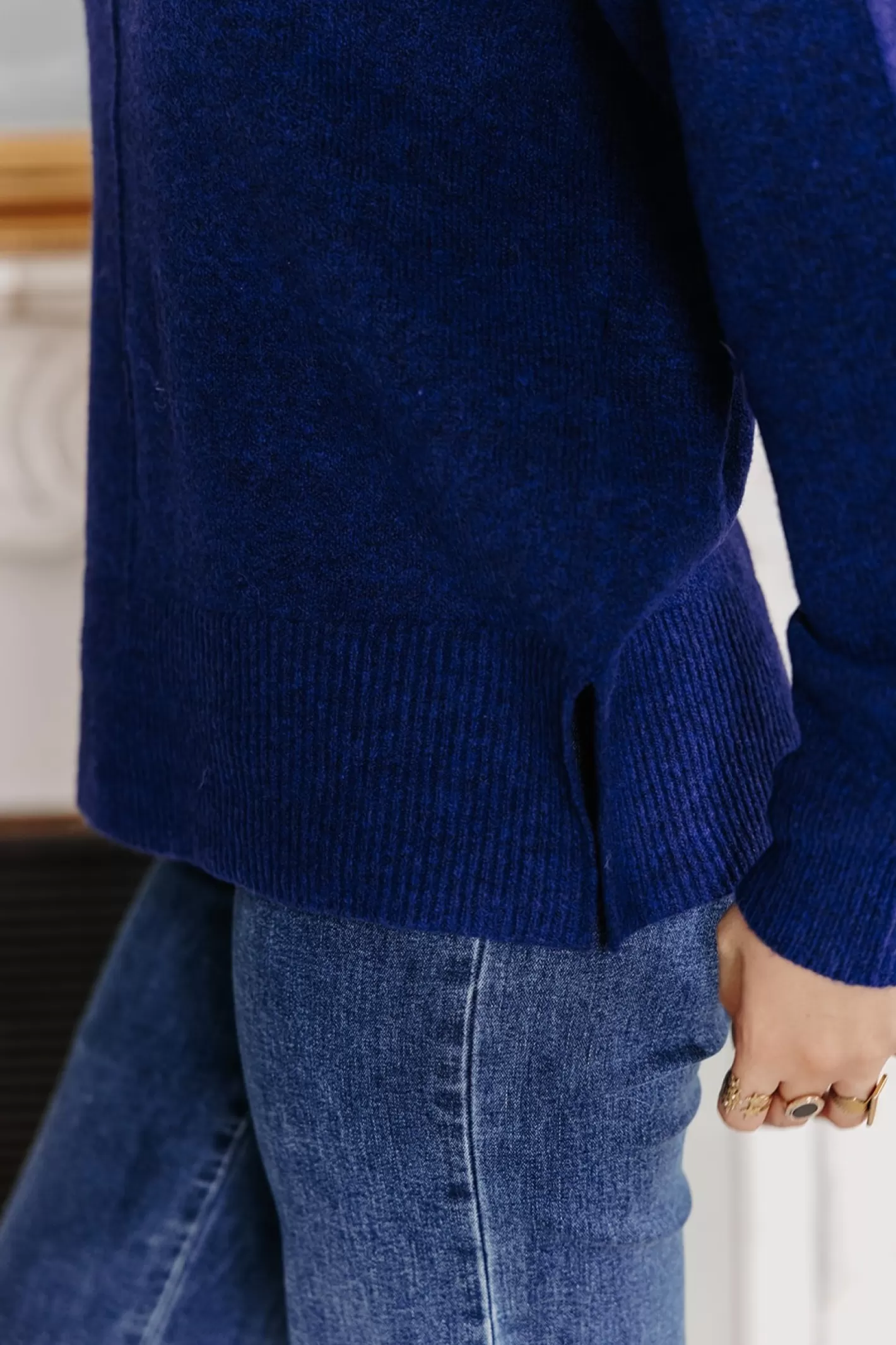 Hello MALOU ! Avec lui, c’est simple de composer des looks quand les températures baissent. Un doux petit pull en laine bien douillet avec son col montant et sa couleur bleu ultra profonde. Chez mlle, on le porte avec un jean brut pour un look monochrome.