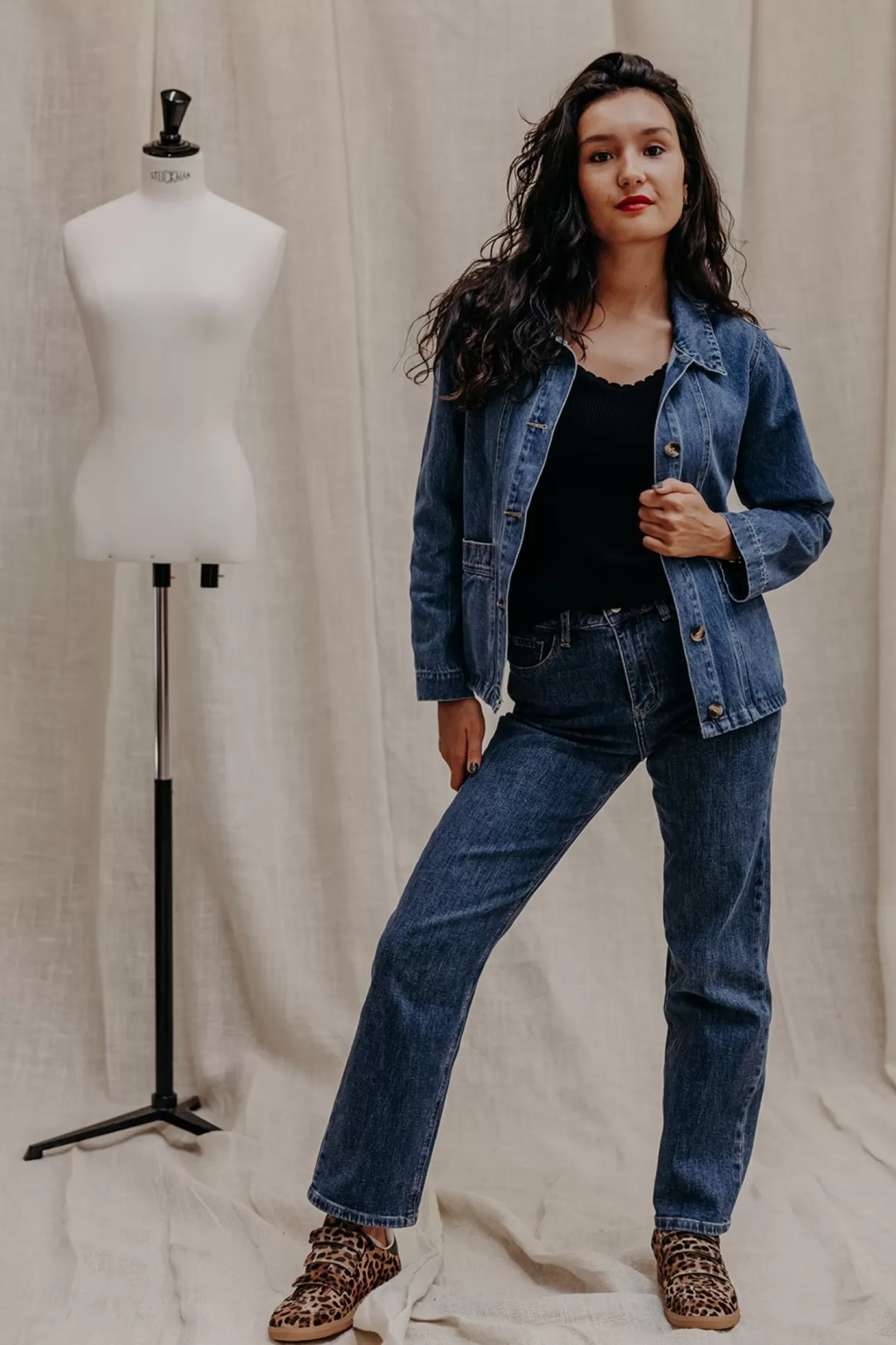 On vous présente la veste la plus cool de la saison, c’est la veste worker AMANDINE ! Un modèle emprunté à la veste de travail, 2 poches plaquées devant, un twill de coton épais et résistant sans oublier l’iconique col chemise des vestes worker. Chez mlle, on la porte avec un total look denim.