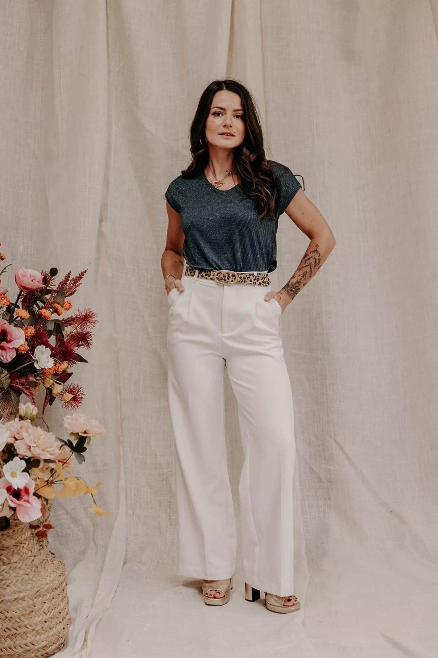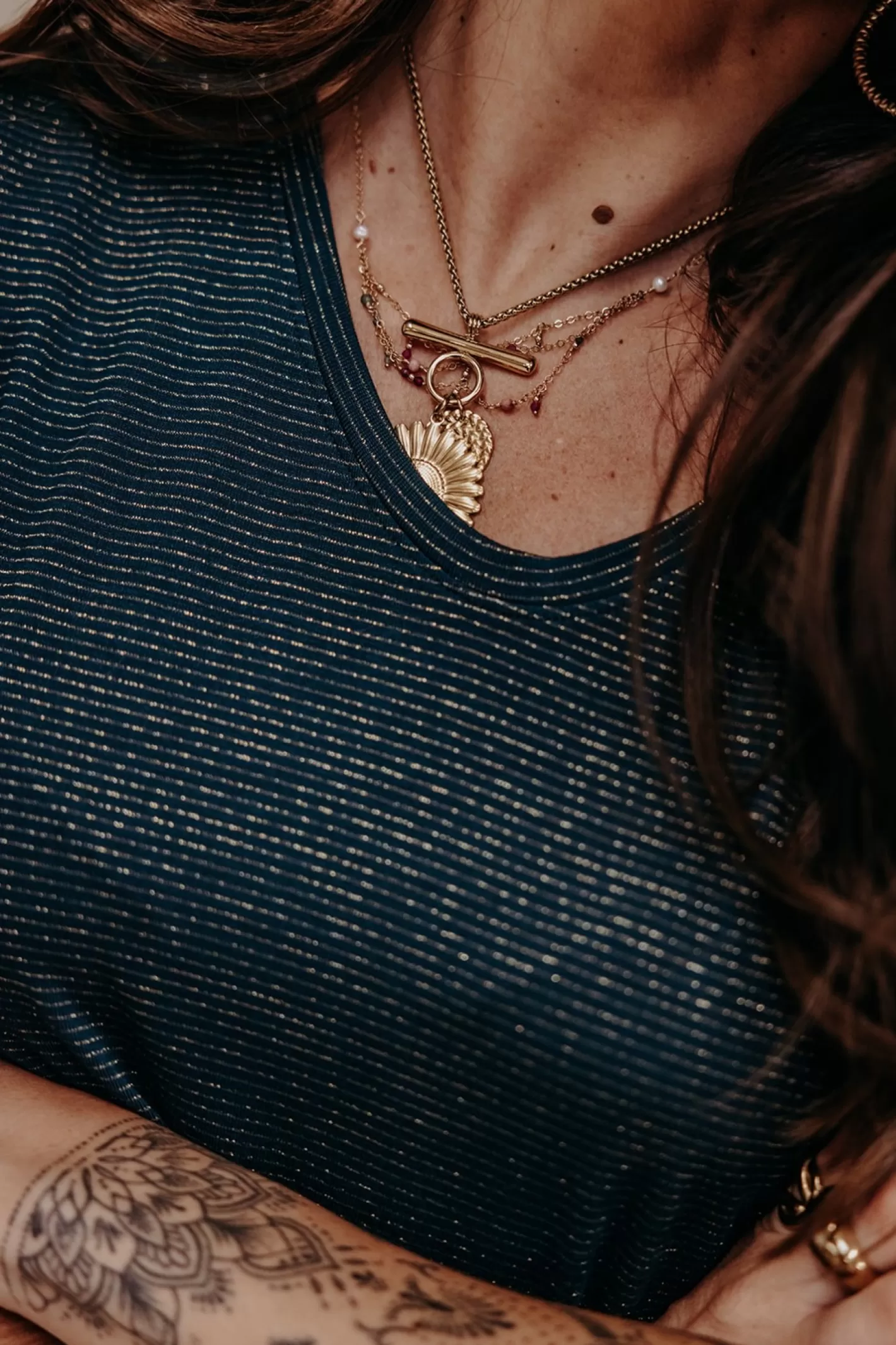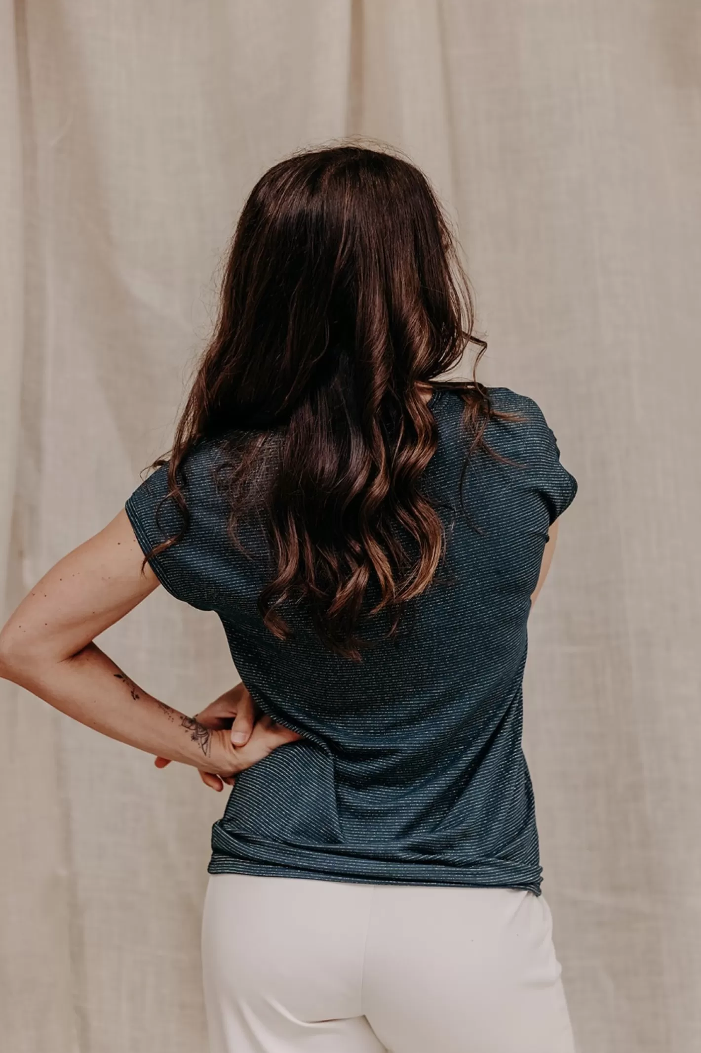 BILLOTEE, c’est un must-have avec son joli col V. Le petit basique de son vestiaire : un bleu sublime, des rayures légèrement brillantes pour le pimper, un toucher ultra confort… il a tout pour plaire ! Facile à coordonner avec un jean, un short ou une jupe.